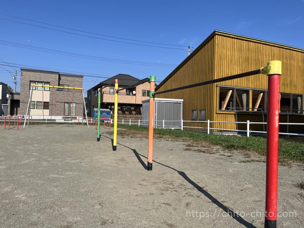 鉄棒奥にあるブランコ。握るところが鉄剥き出しじゃないから、手が臭くなりにくそう。